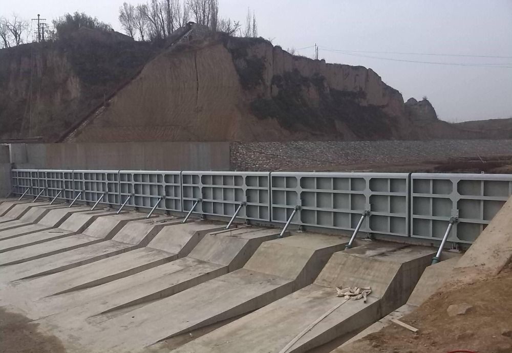 在水利水电建设中,随着城市用水、景观建设及环境整治和灌溉、发电的需要,翻板闸,水闸和橡胶坝得到广泛的运用。然而,橡胶坝等生产比较复杂,运行时充水(充气)升坝或放水(放气)塌坝时间较长,影响快速截流或泄洪,再加上橡胶易老化的弊端,容易发生质量事故。现在市场上出现大量钢结构闸门,或翻板闸但无论是提升式或卧倒式,单孔都很难适用较宽的河道。钢坝闸是一种新型可调空控溢流闸门,它有土建结构、带固定轴的钢闸门门体、启闭设备等组成。这种建筑物适合于闸孔较宽(10米~~100米)而水位差比较小的工况(1~~7米),由于它可以设计的比较宽,可以省去数孔闸墩,所以不仅结构简单,可以节省不少土建投资,而且可以立门蓄水,卧门行洪排涝,适当开启调节水位,还可以利用闸门门顶过水,形成人工瀑布的景观效果。